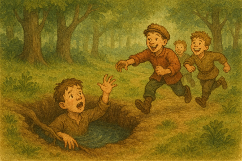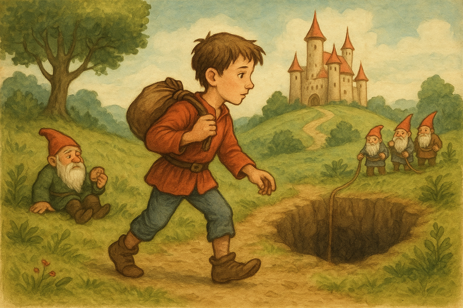 The boy continued, but soon fell into a deep pit. He tried to climb out, but couldn’t. He jumped again and again, but the ground crumbled, and he sank even deeper. Just when he was about to despair, a group of dwarves appeared, threw him a rope, and saved him. Grateful, the boy went on his way.